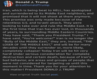 Pernyataan Donald Trump dalam unggahan di platform Truth Social, yang menyebut Iran sebagai “ The Loser of the Middle East” dan menggambarkan Iran sudah “menyerah” kepada negara-negara tetangganya, tidak menganggambarkan situasi geopolitik yang sedang terjadi. Emaridial Ulza menyebut pernyataan tersebut tidak lebih dari sekadar retorika politik dan bukan gambaran nyata dari Timur Tengah saat pertempuran berkecamuk.